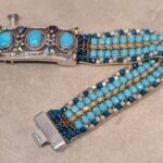 Sterling silver clasp with secured bar closure, with 3 Turquoise stones and set gem stones are peridot, garnet, blue topaz, citrine, Amythyst. Bracelet is woven with a fine silk thread using the highest quality Czech fire polish beads and the best Japanese seed beads.